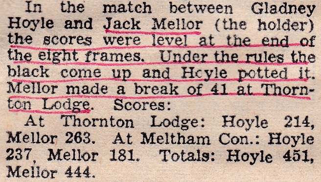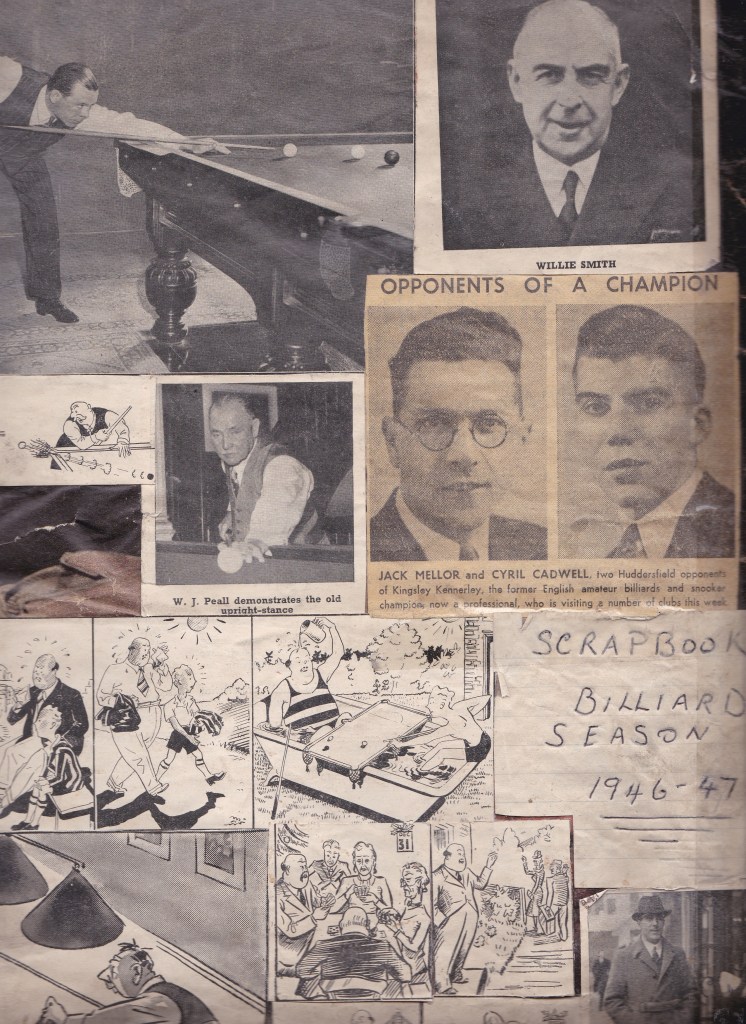 At the start of the season, plans were being made for Kingsley Kennerley – the former English Amateur Billiards & Snooker Champion, now a professional – to spend a week in Huddersfield playing exhibitions against local players. He would play at Meltham Liberal Club over two nights, along with I.C.I Rec Club, Dyers and Finishers, Greenside WMC and Leeds Road Con. on other nights during his week-long visit. At Meltham on the Monday he would play Jack at snooker and Cyril at billiards, and on the Thursday it would be reversed. Kingsley beat both of them at billiards and snooker but both of them won one of the three snooker frames played on each night.