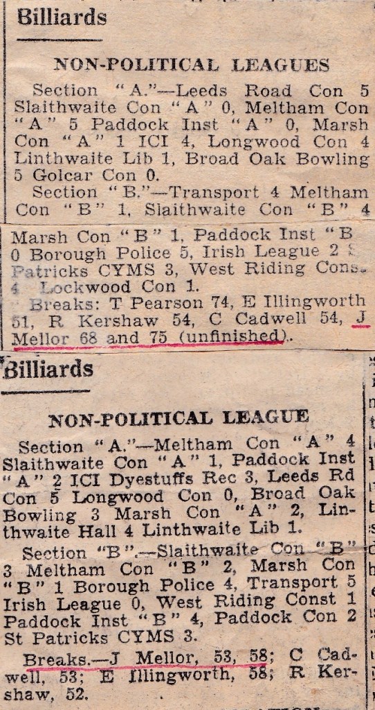 Jack entered the English Amateur Billiards & Snooker Championships (Huddersfield Area) for what I believe was the first time, and had a bye into the second round of the billiards. In the snooker, because of the number who entered, he had gone straight into the semi final to play either H. Todd of Accrington or Clifford Percival of Huddersfield. Before those games, he is playing for Meltham Con. in the Non-Political Billiards League. I presume it’s called the Non-Political League because there are Liberal and Conservative Leagues, with only those types of club allowed to compete in them. As you can see on the right, there are all kinds of clubs in the Non-Political League, Con. Lib, Inst, including clubs with no political persuasion at all. Jack is regularly making breaks over 50, as is his team mate Cyril Cadwell.
