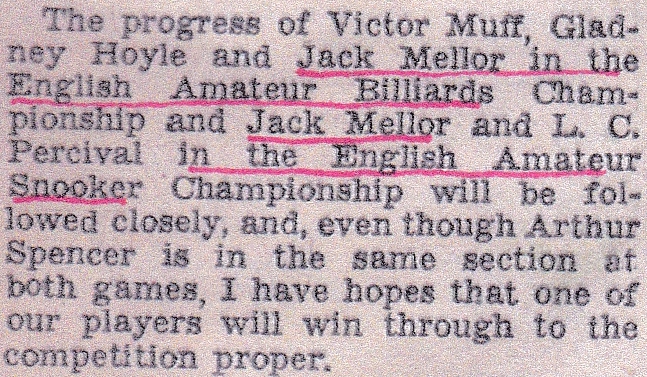 Jack lost his second round game of the English Amateur Billiards Championship against Gladney Hoyle, who then went on to beat Victor Muff in the semi-final. Hoyle’s final opponent was E. Evans of Rochdale who he also beat, taking him on to play in the Championship proper at Burroughes Hall, London. Jack lost his semi-final game in the English Amateur Snooker Championship to Clifford Percival who went on to beat F. Elton of Normanton, and now joins Hoyle in London.