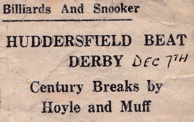 Inter-Town games at the moment seemed to be organised by each Association without any league structure. Jack was selected for the Huddersfield snooker team to play Leeds at Leeds Road Conservative Cub, which I suppose, as Huddersfield Snooker Champion, he should be. They won the game on aggregate 359 -261: Jack lost one of his games but Gladney and Selwyn won both of theirs.