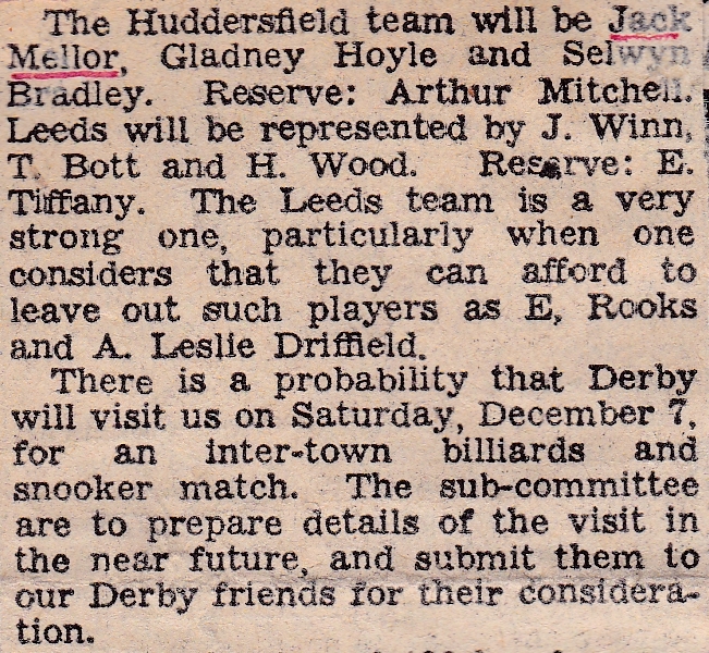 A different type of Inter-Town game was arranged for the Derby visit, in order to involve more players and clubs – this will be 15-a-side game. One player will play a 600 up game of billiards and then six will play 300 up, along with eight playing three frames of snooker. Jack was selected to play snooker and Cyril Cadwell would play billiards; needless to say they would be playing at Meltham Con. The result of this was Huddersfield winning the billiards by 2247 – 1618 and the snooker by 1250 – 1119. Victor Muff had a break of 188 and Gladney Hoyle one of 135, while Jack won two of his three games of snooker.