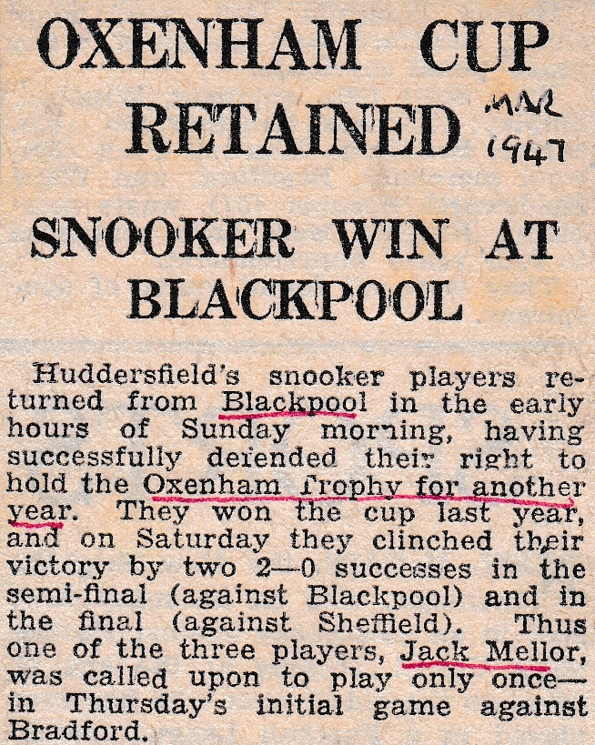 Although Jack didn’t win any individual trophies, he was part of many Huddersfield teams that won Inter-Town games, with the Oxenham Cup being the most prestigious. He also played with and against many of the top local players in league and cup games, plus two top professionals which will have helped him develop his game. It is noticeable that he had a foot in both camps this season, and I think it was a year that he changed from a snooker player to a billiards player.