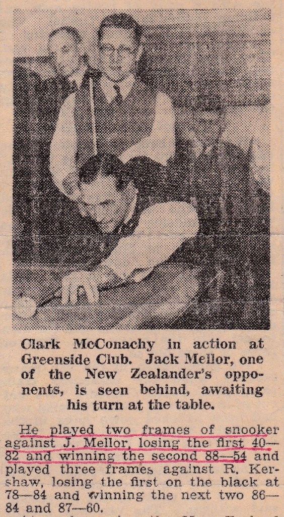 New Zealand professional Clark McConachy was in England touring and playing exhibition games against local players, and visited Huddersfield at the end of February. Clark was renowned for his ability to screw and stun, and showed this after a game by screwing the white ball back from the pink spot into baulk. He played Muff & Hoyle at billiards and Jack, Percival, Bradley & Kershaw at snooker. Jack won one and lost one but was given 42 start, so the one he won would have been a re-spotted black without the start. Clark claimed his position by making what was believed to be the first century snooker break in Huddersfield. He took 13 reds with colours and then the colours up to and including the blue. At billiards he had a break of 313 against Victor in an afternoon session but beat that record in the evening with a break 398 against Gladney.