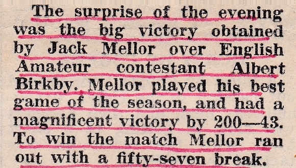 Below are the known results for the season, and the stand out result was this particular one identified in the article. Albert Birkby was the “star” of the Halifax side and had reached the final of the Yorkshire Area of the English Billiards Championship to play Leslie Driffield. Jack and Albert would cross swords many times in the coming years, with this result setting the tone for future meetings, with Jack winning most of the matches in which they contended.