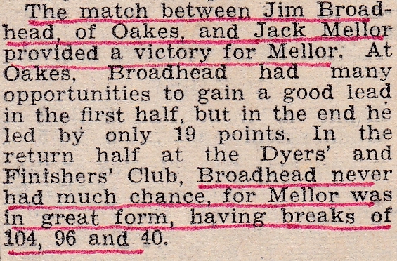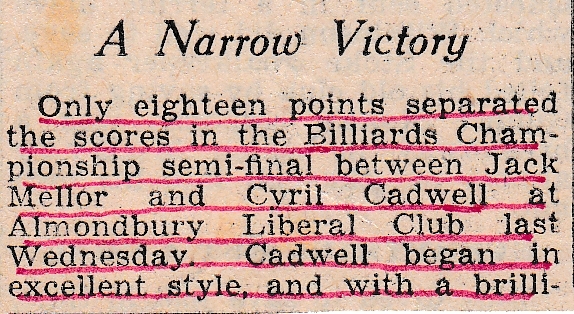 The Huddersfield Billiards Championship had reached the quarter final stage, and some of the players who made it through were Harold Burkinshaw, Ronnie Kershaw, Harry Sisson and the Dyers and Finishers player Jack Mellor. Jack and his family had left the North Ward Liberal Club and were now living at Lower Brow Road, Paddock. Jack Brindley, Jack’s team mate from the Huddersfield Yorkshire Inter-District side, was playing at the Dyers and Finishers, so perhaps that’s why Jack had gone there. Jack played Jim Broadhead in the quarters and was 19 behind after the first away leg. However he was in great from in his home leg at the Dyers and Finishers club, and won comfortably with breaks of 104, 96 and 40. Jack’s semi final against Cyril Cadwell, his old club mate from Meltham, was a close affair as can be seen by the report.