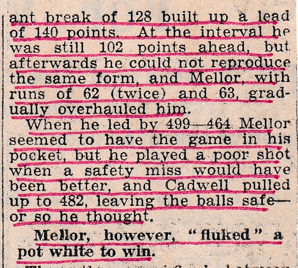 Jack’s final opponent was Ronnie Kershaw, who was also in the snooker final against Trevor Sisson which had been played the night before – as both finals were to be played at the revived Huddersfield “Billiards Week” at the Dyers and Finishers club. Jack would have no advantage however, as they were to erect a new table, along with tiered seating for the large crowd that was expected. The billiards final was a bit of an anti-climax as neither player really performed at their best. The match was saved from “mediocrity” by the narrow margin of victory, which saw a win for Jack by 600 – 558. With that, Jack wins his first of many billiards titles and poor Ronnie becomes a double runner up as he had also lost the night before to Trevor Sisson in the snooker final.