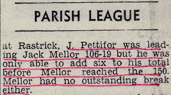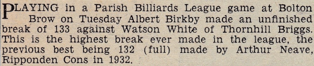 There were some notable scores in the Halifax Parish League: Jack had breaks of 52, 47 and 51 unfinished to reach his 150, as his opponent N. Holroyd of Greetland Dyers scored just 8. Albert Birkby had a record break of 133 unfinished in his game against W. White, with visits of 0, 17, 0 and 133, while White had three visits of 0, 17 and 23.