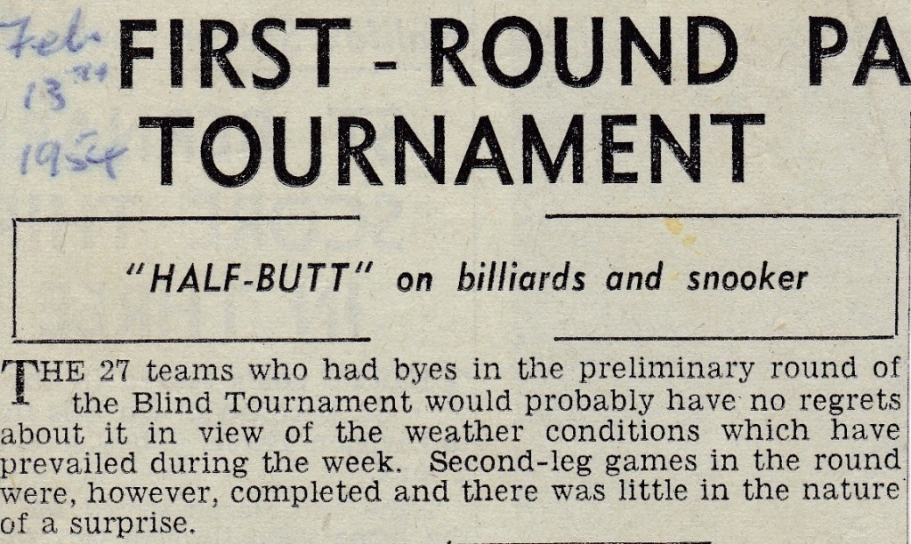 A third competition run by the Halifax Association was the Blind Tournament and Rastrick ‘A’ and ‘B’ were in the first round draw with the ‘A’ team against Wharley Institute, and the ‘B’ team, having beaten Elland Liberal ‘B’ in the preliminary round, had Luddenden Foot Institute. In the first leg the ‘A’ team led Wharley by 259, with every man having a good win against their opponents who could only muster 641 (which included their 300 start). The ‘B’ team did just as well and led Ludden Foot by 215. Both teams must have won but we don’t have any scores as they both went through to the third round by the ‘A’ team, beating Claremont Liberal Club 1757 – 1658 while the ‘B’ team beat Luddenden W.M.C 2216 – 2053.