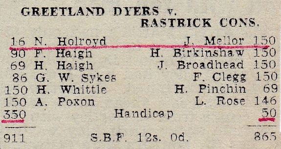 Rastrick played top of the table Greetland Dyers who they beat earlier in the season with 6 winning games, but couldn’t repeat their victory as they only had 4 winners this time. N. Holroyd, who Jack beat so comprehensively in the first game, drew the short straw again but managed to score 16 this time as Jack made a break of 96. E. Johnson didn’t play in this match, replaced by F. Clegg, and that meant that Rastrick actually received a 50 handicap.