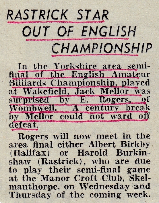 The draw for the Yorkshire Area of the English Amateur Billiards Championship saw Jack get a bye into the semi final, where he would meet E. Rogers of Wombwell whom he had beaten in last years competition at the same stage and venue, Normanton Liberal Club. The match was fairly even on the first night, with Rogers taking a slight lead, but he was more consistent on the second night and, with twenty minutes remaining, led by 200. Jack had more of the running at this point and made a magnificent 111 break, followed by one of 57, but it was too late and he lost by 60. Jack had represented Yorkshire in the previous two years but this year there will be a new face in London as Rogers and the other two semi finalists, Burkinshaw and Birkby have not played in the Championship proper before. Birkby beat Burkinshaw in his semi final and went on to beat Rogers in the final to represent Yorkshire along with Leslie Driffield, the holder, in the Championship proper in London. The Halifax paper seems to get great joy out of Jack’s defeats, as is typified by the report here, probably because they are so few and far apart, especially when their “local” player was doing well.
