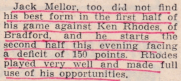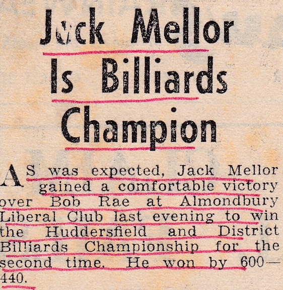 In the Huddersfield Snooker Championship Jack beat Stanley Broadbent 2 frames to 1 in both home and away legs to go into the quarter-finals, where he faced Ronnie Kershaw. We only know for sure that Jack was losing 2 frames to 1 after the first leg but he must have lost as Ronnie was in the final after beating Jack Firth in the semi-final. A great final was seen when Harold Smith won his first title, beating Ronnie by 3 frames to 2. Ronnie had lost the first two games but fought back to level and in the deciding frame both played well and it was a pity one had to lose.