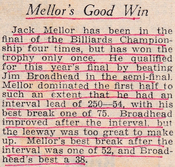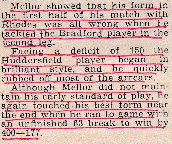 We do not have any reports of Albert’s venture into the great unknown of the championship proper but next year there is a mention in the Huddersfield Examiner that he was “heavily beaten by Leslie Driffield“. Out of interest, Huddersfield had a representative in the Women’s Amateur Snooker Championship in London, that being Myra Armitage, who played at Fartown Conservative Club. She lost in the second round but put up a good show and her experience will serve her well for the future.