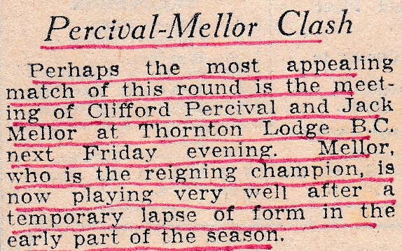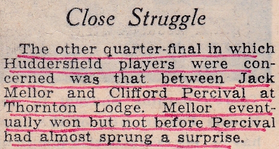 Clifford Percival was Jack’s opponent in the quarter final and the match would take place at Thornton Lodge. Clifford was always thought of as a snooker player but is playing billiards better now than he has done for many years. In the two previous rounds he beat Willie Mills and Harold Burkinshaw who both play for the Huddersfield League team, so he cannot be taken lightly. Jack dominated in the early stages of the match making three breaks over 50 and led 250 – 122 at the interval. Clifford was not finished however and came back with a run of 93 and 59 to take the lead in early 400’s. It seemed as the holder would be beaten but Jack found his touch and compiled a break of 66 and left a double baulk. Clifford only just failed to score from that position and Jack stepped in to get the points necessary for game.