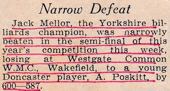 Jack would now meet G. A. Poskitt of Doncaster, who beat Jim Broadhead in his quarter final, and it will the played at Westgate Common W.M.C. Wakefield. Jack couldn’t reach the final for the third year in a row as he was narrowly beaten 587 – 600. Jack led at the interval by 304 – 267 and he increased his lead after the break to 120 but Poskitt fought back and slowly but surely reduced the lead and overtook it at 486. Jack retaliated and was ahead 587 – 551 when he missed a losing hazard in the middle pocket (his favourite shot) and Poskitt stepped in to run to game with a 49 unfinished break. Poskitt lost in the final to Jack Brindley, 1000 – 651, which was his second victory as two years before he beat our Jack.