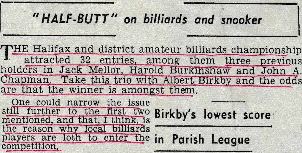 Jack was in great form for the final and the paper says “that when this occurs there is no local player that can approach him”. He created another record in the Halifax League by scoring two breaks over a hundred in the final and ran to game with an unfinished 65. The reporter asked Jack at the interval how he liked the playing conditions and he expressed his great satisfaction, saying that everything was ideal. He expected to complete his second century of the match when the game resumed, as he was in play with 61. He not only topped the century again but ran to 157 before coming out. His previous big break on his fourth visit to the table had been 109. With other breaks of 43, 53, and 65 he had little difficulty in retaining his title, with an emphatic 500 – 109 victory. Albert was in an unenviable position of being a spectator for most of the match and couldn’t get into the game. Jack therefore added the Halifax title to his Huddersfield title as he had done the previous year, and as Harold Burkinshaw had done two years before.
