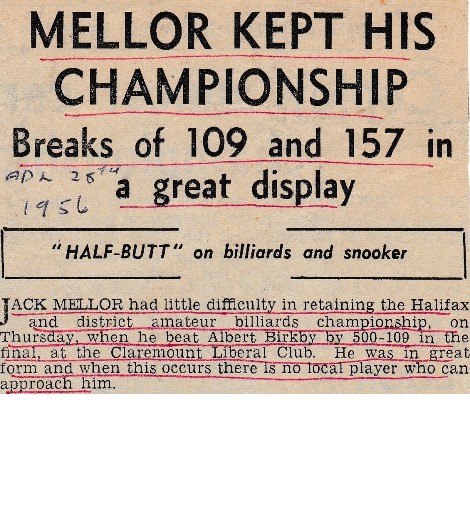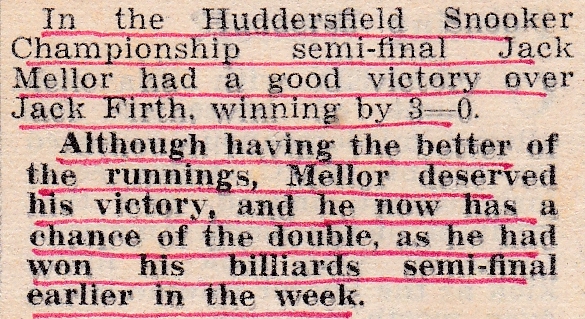 Jack was 2 frames to 1 up against J. Greenwood of Cowcliffe Liberal Club, after his first leg of the Huddersfield Snooker Championship first round match. He then went on to win the second leg. In the second round, Jack played Raymond Wade of Newsome and was leading 2 frames to I after the first leg, and again went on to win. He was 2 frames to 1 down in his quarter-final match against holder Harold Smith but went on to win and reach the semi final. Jack had a good victory in the semi-final against Jack Firth by 3 frames to nil and now has a chance of the double with reaching the Billiards Championship final earlier in the week.