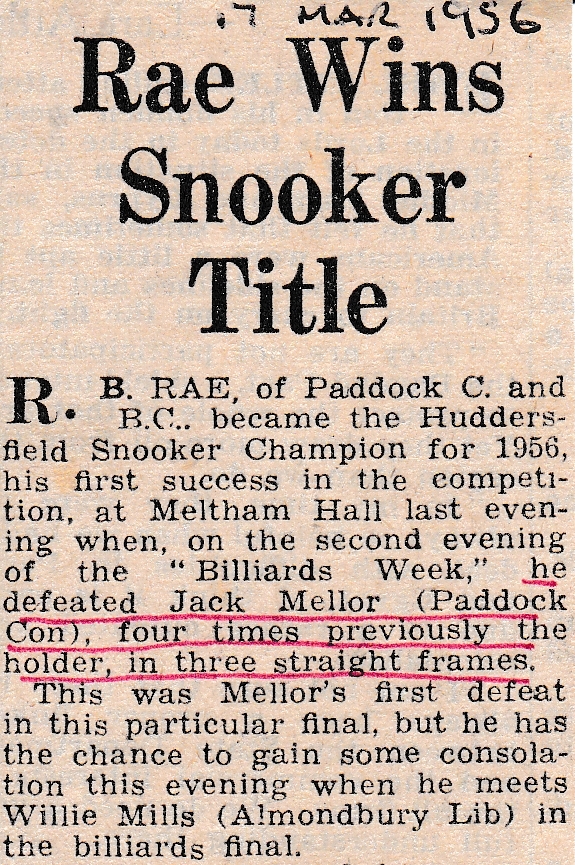 He would meet Bob Rae, of Paddock C. and B.C., in the final, who he beat in the billiards final last year – meaning Bob has a chance to avenge his defeat. Bob Rae, as well as being a snooker and billiards player, also played cricket and has been the “professional” at Paddock cricket club for some years. He had only recently moved to Primrose Hill. He won his first and only Huddersfield title with a comfortable 3 frames to nil victory, as Jack seemed to struggle to find the “feel” of the table. The match was played at D.B. Tractors Sports and Social Club on the second night of the Huddersfield Billiards Week, meaning Jack would at least have chance to gain some consolation on the next evening when he played in the billiards final.