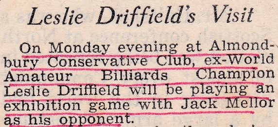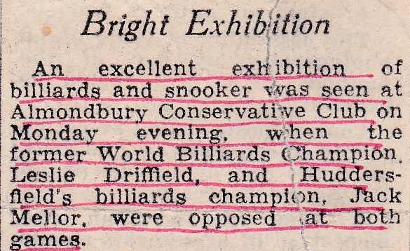 An excellent exhibition of billiards and snooker was seen at Almondbury Conservative Club when former World Billiards Champion, Leslie Driffield, and Huddersfield’s Billiards Champion, Jack Mellor were opposed at both games. Both players were in grand form and in just over an hour 700 points were scored. Leslie made the highest break of 115 but Jack was consistent with breaks between 30 and 40 – though careless strokes robbed him of bigger breaks. At snooker, both players went for their shots and the two frames were complete within twenty minutes. Leslie demonstrated outstanding ability at this game and it is a pity he does not play more snooker. The evening was brought to a fitting conclusion with a demonstration of trick shots by Leslie.