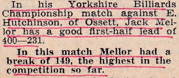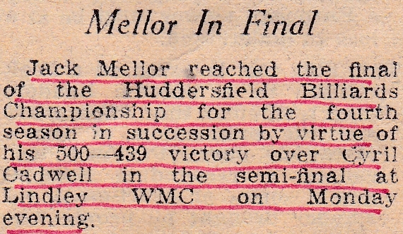 The Huddersfield Billiards Championship saw Jack have a good win over N. Simms in the first round. His next opponent was Clifford Percival in the quarter-finals and was leading by 50 points after the first leg. He went on to win and reach the semi-final were he would play his old Meltham team mate, Cyril Cadwell.