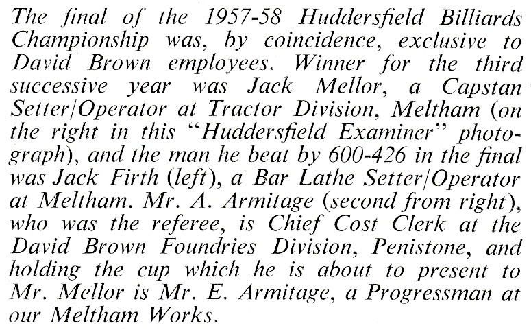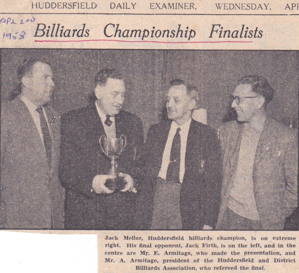 Last year was a poor season for Jack in terms of trophies, with just the one to show for his efforts – another year holding the Huddersfield Billiards Championship. If he knew then what we all learnt later – that the man who presented the trophy, Bill Shankly, would become the legend of Liverpool – it would have certainly meant more. Jack was also, once again, a vital member of the Huddersfield Yorkshire League side that won the championship for the 6th year in succession. There might have been more but from the reports we have, he only recorded two century breaks during the season.