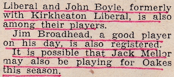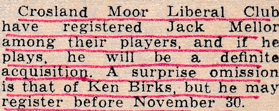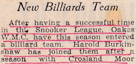 It was reported early in the season that Oakes WMC, who had done well in past years in the snooker league, would be entering a team in the billiards league this season. Harold Burkinshaw would be playing for them after a year with Crosland Moor Liberal Club, along with John Boyle formerly of Kirkheaton Liberal Club. Jim Broadhead is also registered. If Jack, as was mentioned, joins them they will have the “Huddersfield Stars” that “assisted” Rastrick Constitutional in the Halifax Parish League a year earlier. We do not have any reports to show that Jack played in the Billiards League for anybody. It was later reported that Crosland Moor Liberal Club had registered Jack to play snooker with them in section ‘C’ but he must have changed his mind as he turned out for Paddock Conservative Club. This is not really surprising as he was living at Lower Brow Road and the club was only 100 yards from his house. It just goes to show that “fake news” isn’t necessarily a new thing invented by Donald Trump – it has indeed been around a lot longer than that.