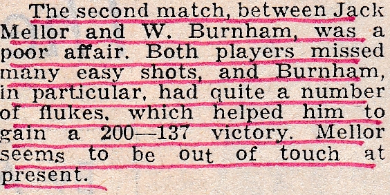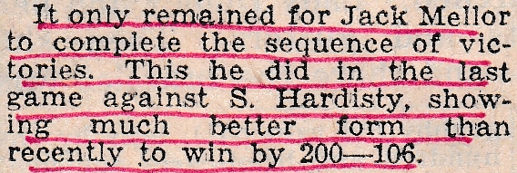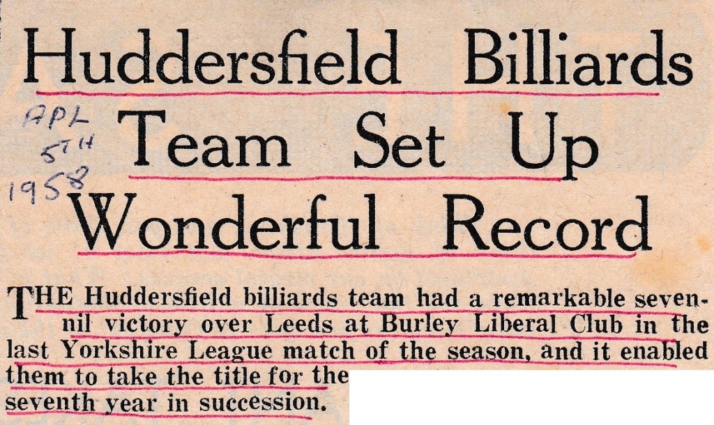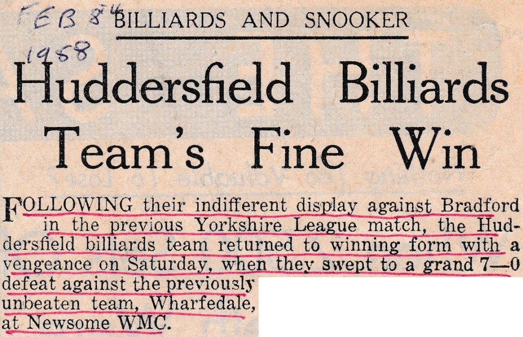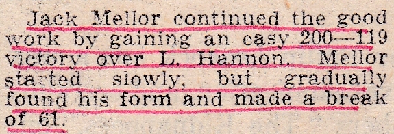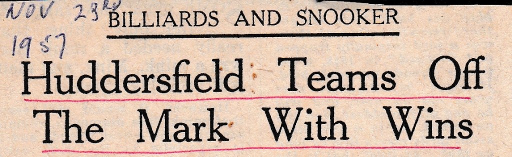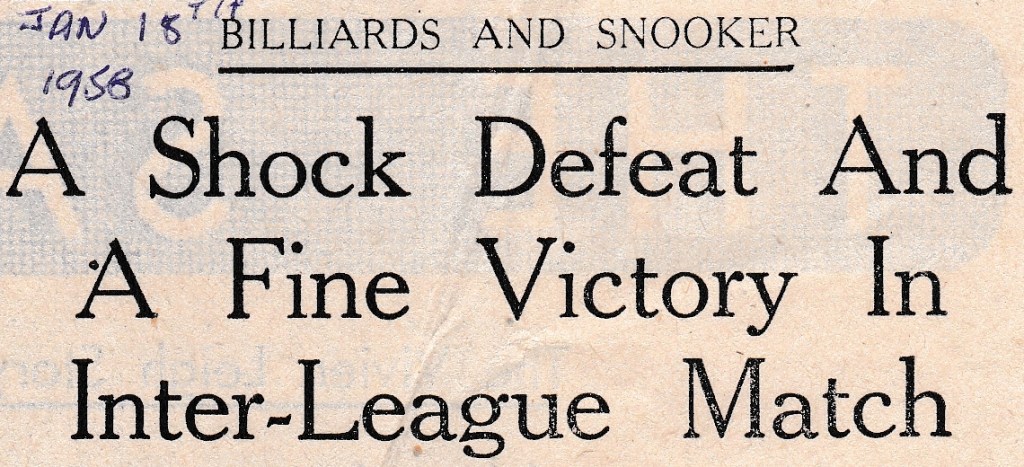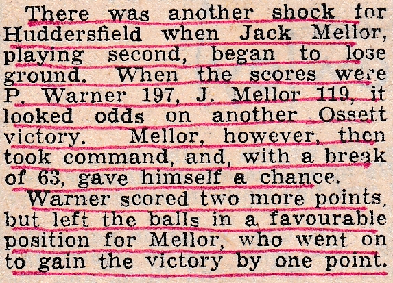 The ‘shock defeat’ was that of the billiards team that hadn’t lost for the past three years, and saw the first victory for Bradford. The ‘fine victory’ mentioned was the snooker team that inflicted Bradford’s first defeat of the season. Even in the first game, Harold struggled, but a break of 58 late on helped him over the line. As the report says, Jack was out of touch and in the last match Gladney was unable to settle.