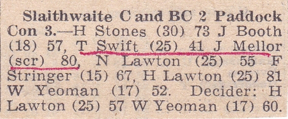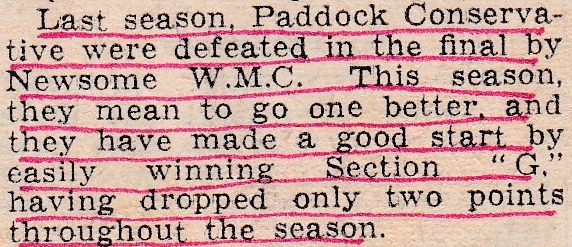 The same 7 teams as last year were in this years Yorkshire Inter-District League, where Huddersfield will be looking to extend their undefeated run to four years and their championships to seven. Huddersfield have been fortunate in being able to play a more or less settled team during these past six successful seasons. Gladney Hoyle and Jack have long been regular members of the side. In the first few seasons Jack Brindley was the third man, and when he retired owing to ill health Harold Burkinshaw took over. Now Cyril Cadwell is fighting for a regular place and would get his chance before the end of the season – as you will see.