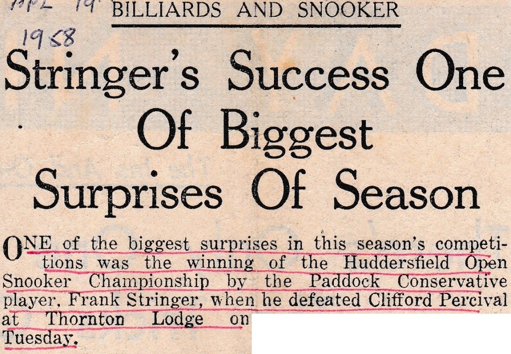 There were very few reports saved of the Huddersfield Snooker Championship, which would indicate that Jack either didn’t enter or was eliminated at a very early stage. Jack’s team mate at Paddock Conservative Club, Frank Stringer, was a surprise winner over Clifford Percival in the final. Clifford has been one of Huddersfield’s leading snooker players for many years but Frank started his first final on form and won the first frame by 87 – 25. Clifford answered in the second frame by winning it 69 – 48 with the third frame going to Frank by the score of 57 – 26. It looked like a five frame final as Clifford lead 25 – 0 in the fourth frame but Frank, with crisp, clean potting which he displayed throughout the final, came back to win 58 – 33 and thus secure the win. That win created a record, for never before have the Billiards and Snooker Championship gone to the same club in the same year – and Jack also of Paddock had won the billiards.