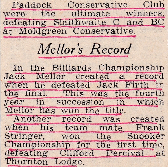 It was a season of many records it seemed. As already mentioned Jack created a record when he won the Billiards Championship for the fourth year in succession. Then Frank Stringer won the Snooker Championship which created a second record, with both players coming from the same club. If that wasn’t enough (and showing something that wasn’t mentioned in any reports), Paddock Conservative Club won the Snooker League. Who was part of the Paddock team? None other than Jack and Frank. They must have had to clear some space on the shelves at the club to make way for all the trophies. I dare say that some beer was drunk at the club, at what must have been one heck of a presentation night that year.