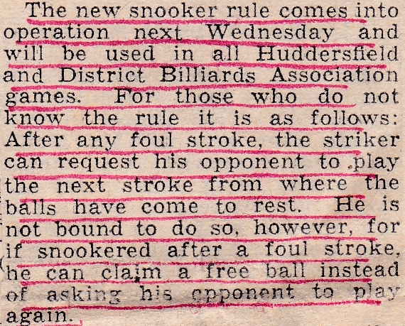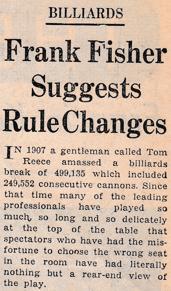 In March there was a very large piece in the paper relating to more proposed rule changes. As you can see here, the piece starts with the story of Tom Reece, who amassed a billiards break of 499,135 which included 249,552 consecutive cannons. Since that time many leading professionals have played so much of the game in such a delicate way at the top of the table, that spectators who have had the misfortune to choose the wrong seat in the room have had literally nothing but a rear-end view of the play. ‘Because of this’, assert many billiards enthusiasts, ‘the game of billiards as a public spectacle was killed – killed by the experts who continued to compile long runs of nursery cannons’. Frank Fisher, of Birkby, is one of these, and because he thinks there is a public call for what he calls the right type of billiards he has put forward to the Yorkshire Billiards Association (of which he is the vice president) suggested changes in various rules of the game. It is suggested that top line players cannot play at the top of the table for too long a spell. He has also suggested “that the crossing of the baulk-line shall be made by a stroke which scores one or more of the last twenty points of each 100 points. The referee shall announce the necessary crossing of the baulk-line when it takes place and shall inform the player when he has scored eighty points of each 100 points made in the course of a break.” He also suggested alterations to the number of times the red can be potted off its spot, from 2 to 5 and the number of hazards, from 25 to 15. Some of these suggestions were approved by the Association and some weren’t but it shows that the game was evolving; hopefully for the better.