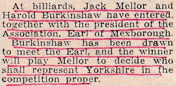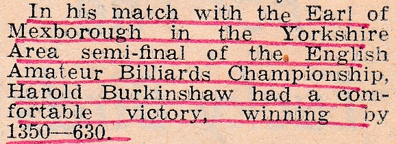 The English Amateur Billiards Championship saw the same three entries as last year, Jack, Harold Burkinshaw and the Earl of Mexborough. The draw saw Jack get the bye into the final, to play Harold or the Earl: it is anticipated that Harold will beat the Earl just as Jack did last year. The Earl is the President of the Association and Control Council as well as the President of the Yorkshire Association, and enters more through duty than with any expectations of winning. As expected, Harold did beat the Earl quite easily 1350 – 630 and now meets Jack in the final at Almondbury Liberal Club to see who will travel to London for the Championship proper.
