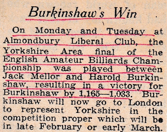 The Yorkshire Billiards Championship would have four Huddersfield players entered by the the Association, Jack, Cyril Cadwell, Harold Burkinshaw and Jack Firth. In the first round Jack led Trevor Sisson by just 37 points after the first leg. We have no news of the second leg, but Jack went on to win as in the next round he faced his mate, Harold Burkinshaw (who he lost to in the area final of the English Amateur Championship). Jack was in a good position to reverse his loss as after the first half of the match he led Harold by 400 – 271 which included a break of exactly 100. In the second half Jack scored 200 points before Harold made any break of note. Jack had a break of 125, which was the highest break of the competition so far and meant an easy victory was achieved by nearly 300 points.