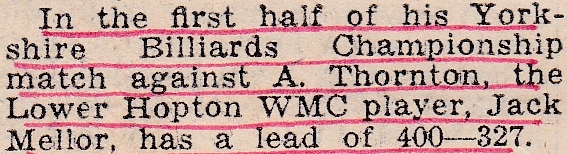 The next round, effectively the Huddersfield Area final, saw Jack play A. Thornton, of Lower Hopton WMC. Thornton had beat Jack Firth in the previous round, and Jack led him by 400 – 327 after the first night. On the second night Thornton, with a break of 72, soon wiped out his arrears but after that could do little right and Jack ran out an easy winner to reach the semi finals.