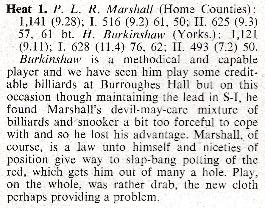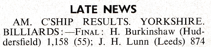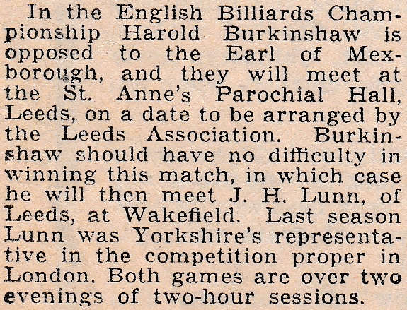 Only Harold Burkinshaw entered the English Amateur Billiards Championship this year from Huddersfield, and he played the Earl of Mexborough. He beat him and went on to play last years Yorkshire representative in the championship proper, Jack Lunn of Leeds. With no reports to refer to, I have looked in the Billiard Player magazine for information and found these two snippets. I should perhaps refer to the 250 magazines that Jack saved more often, as they do report on county championships and English qualifying games. They not only give us the scores but also a small report of the game and the writers’ opinion of the players – which is not always complimentary.