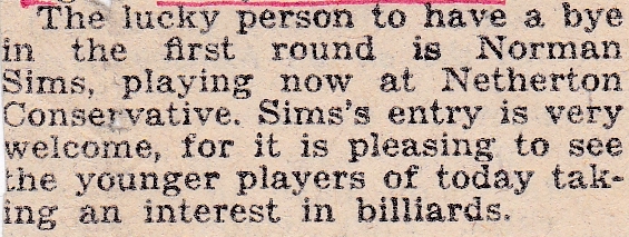In the Huddersfield Billiards Championship Jack had a good victory over Norman Sims to reach the last eight of the competition, but with no further reports we do not know who he played. However, as he isn’t in the semi-final, we do know that whoever he played was able to beat him. The league handbook tell us that winner was Harold Burkinshaw for the second consecutive year.