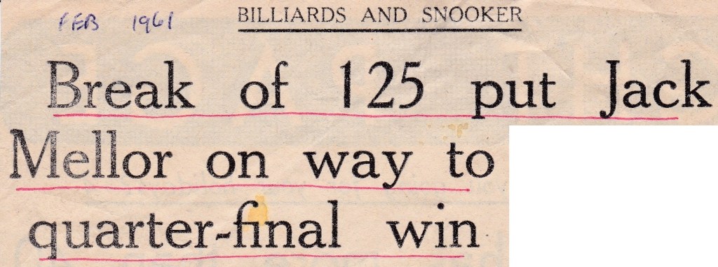 John Dunning the well known Morley snooker player, was his opponent and in the away leg Jack had a lead of only 14 after being over 150 points to the good at one point. Dunning was the better player in the early stages of the Paddock leg and it looked as if he would create a surprise. However, as time went on Jack came more into his own and played the type of billiards for which he is known. With the help of a well constructed break of 125 he passed Dunning and went on to win by 800 – 690.