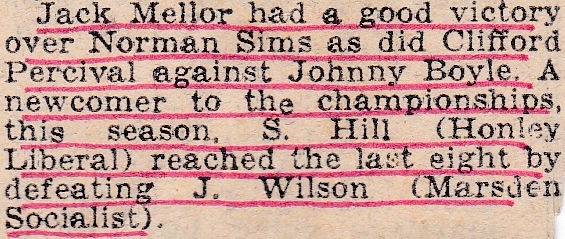 Jack would play Clifford Percival in the first round with the first half of the game being played at Paddock Conservative Club. We have no results of the match but Jack went on to win and was in the second round draw which had him, yet again, playing his old rival from Halifax, Albert Birkby. Yet again, he must have beaten him, as Jack makes it through to play in the quarter-finals.