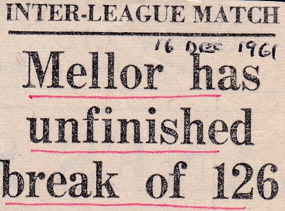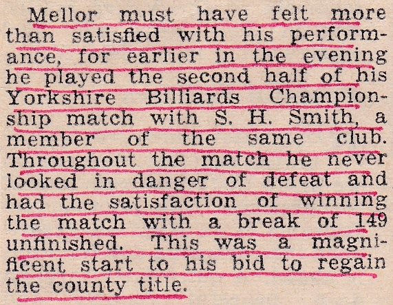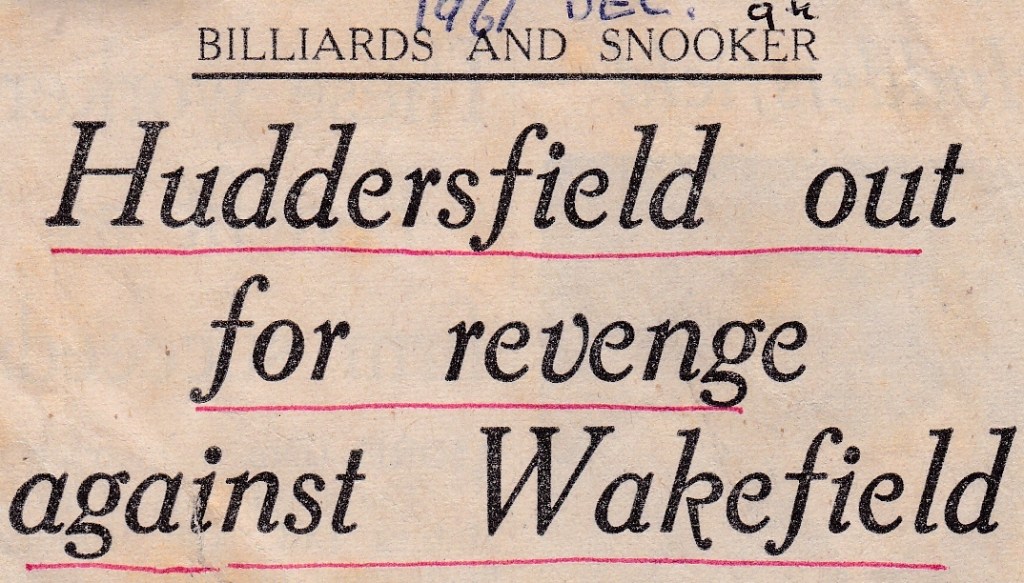The headline refers to last season when Wakefield beat them in the corresponding game at Golcar Con. Harold got them off to a good start, winning easily against A. Bedford, then Jack was ruthless when he played L. Hannon making breaks of 33 and 32 before running out with an unfinished 126. Cyril continued his good form with a comfortable victory over L. Allot. No further reports of how Huddersfield did in the League, which is a shame after their good start, but in keeping with the lack of reports generally found across this season.