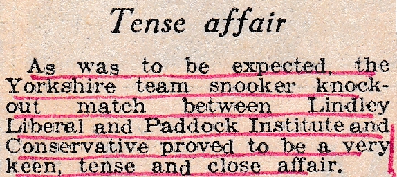 Lindley Liberal Club have entered and will play Paddock if they beat Thorpe WMC of Wakefield in their first round match. Lindley did just that and have home leg advantage first, in a repeat of last years draw in which they were victors. Jack gave Paddock a good start winning both his frames, but Jack Jones levelled by winning his two frames against Frank Stringer then Clifford Percival, and Peter Fisher shared their games – so it was all to play for in the second leg. With no more reports, we do not know how this very keen, tense and close affair ended: more research required.