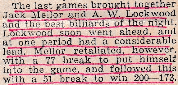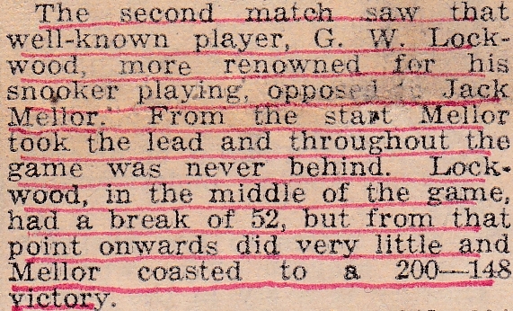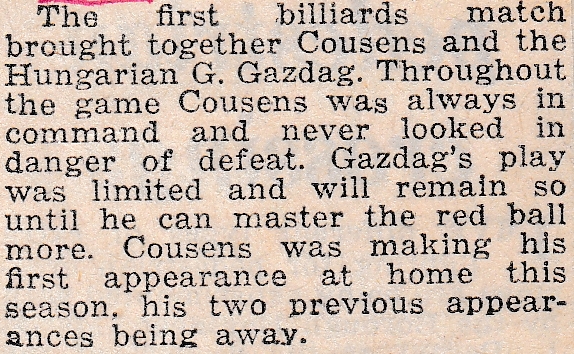 Again, the headline is for the snooker side who need a good victory to finish second in the league – something which does attract championship money. They did just that, and it is reported that if Jack Firth had been in the team from the start of the season, the Championship could well have come to Huddersfield. Brian seems to have found his feet at this level and had a good victory over the Hungarian. Harold had a moderate game with neither player producing anything of note, and finished the season on a losing note. Jack signed off with a win in the best game of the night, with breaks of 77 and 51. Leonard Oldham, the reporter, seems quite upbeat in his report, stating that the teams that ended the season should hold their own next year. At billiards that was Jack, Harold and Brian. At snooker, Tommy Donlan, Jim Dennison and Jack Firth.