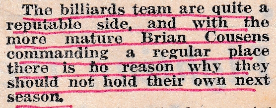 Not the headline our billiard team wanted but it seems they hadn’t done enough in the season to warrant a headline of note. Harold was ill, and with Jack Firth moving to the snooker team, Cyril Shackleton was brought in. Brian continued his good form to prevent a white wash and it looks as if he would be in the side for the foreseeable future.