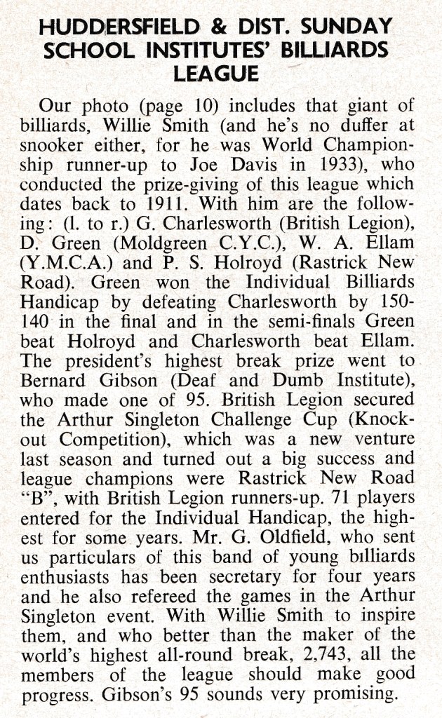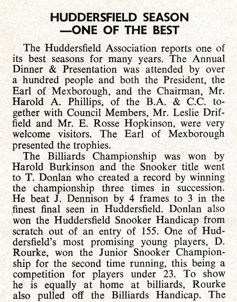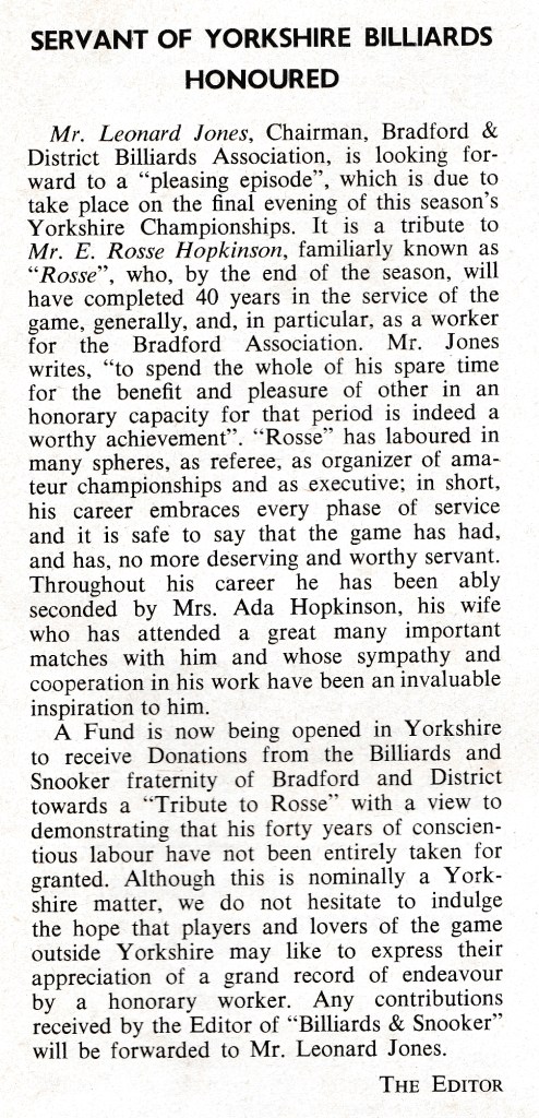 I have managed to find some articles in the Billiards and Snooker magazine which, considering it is a National publication, is very good. They are excellent at providing coverage for the whole of England, but I think the contributions sent in by “Rosse” is a big factor in Yorkshire getting the amount of column inches they receive.
