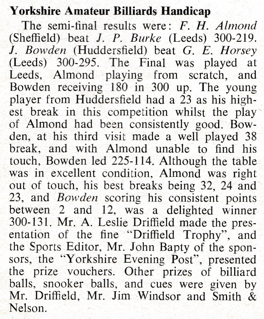 Looking through the Billiards and Snooker magazine there wasn’t really anything of note which happened in Huddersfield during the year, but there was a report of the Yorkshire finals. Much to my surprise, Huddersfield had a winner in the Billiards Handicap: J. Bowden beat F. H. Almond. I’m not 100% who J. Bowden played for in Huddersfield but there was a report in 1959 of a J. Bowden entering the Yorkshire Junior Billiards Championship, and he was playing for Cinderhills WMC, Holmfirth. He is mentioned again in 1961, playing in the semi-final of the Huddersfield Junior Snooker Championship, though that time he was playing for Underbank WMC club. He should be given a lot of credit for entering this prestigious competition, as he would have played some very good players. Almond, as his handicap of scratch proved, was a very good player but Bowden played to his strengths and made the most of his 180 start – resulting in his victory.