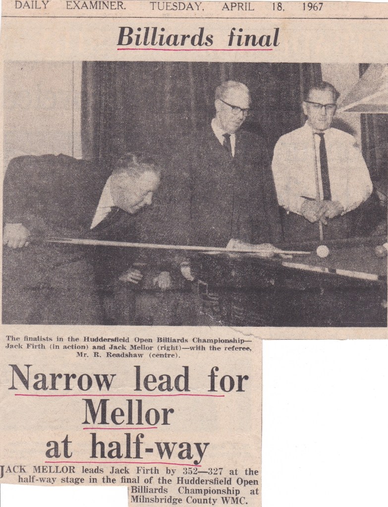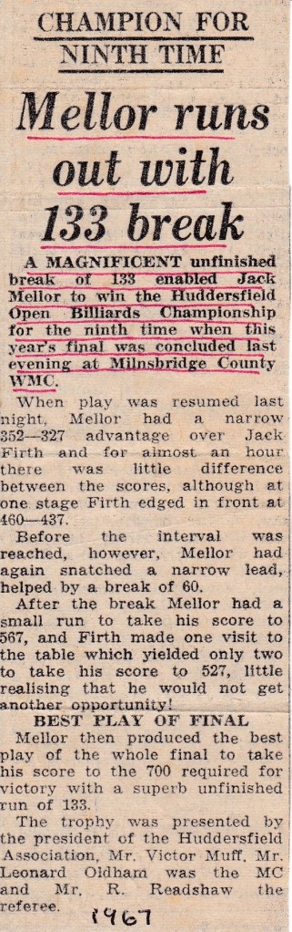 In the semi final of the Huddersfield Billiards Championship, Jack beat his old mate, Harold Burkinshaw with a score of 400 – 283. Some good billiards was seen at Marsh Conservative Club, as these two stalwarts of Huddersfield billiards and snooker lock horns for the umpteenth time. At the interval Jack led by 201 – 181 in a first half which saw Harold make a break of 103. Jack then followed with a break of 79. In the second half Jack took command and, with a break of 108, made sure of victory.
