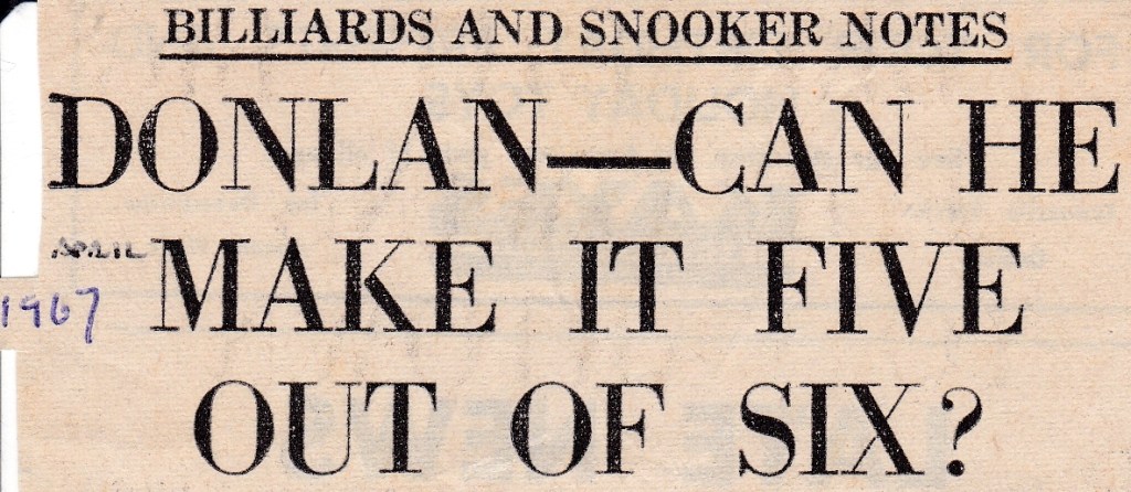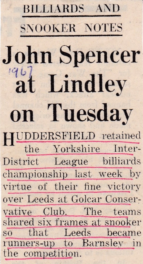 As was the case last year, there are few reports here and the first one comes from even later in than before. The April report mentions that Tommy Donlan is attempting to get to the final of the Huddersfield Snooker Championship with hopes to win it for the fifth time in six years. His opponent was Denis Rourke who had won the Junior Championship in 1963, 64 and 65 and is now a member of the Huddersfield Yorkshire League side. He holds the record for the highest break in the Huddersfield Open Snooker Championship – a break of 84, which he made in this years competition. Looking in the handbook we now know that Tommy didn’t beat Denis, who subsequently went on to win his first senior title. Between them, they dominated the next 18 years of the championship with Tommy winning 8 and Denis winning 7. That rivalry in snooker must have been on a par with Jack’s and Harold’s in billiards.