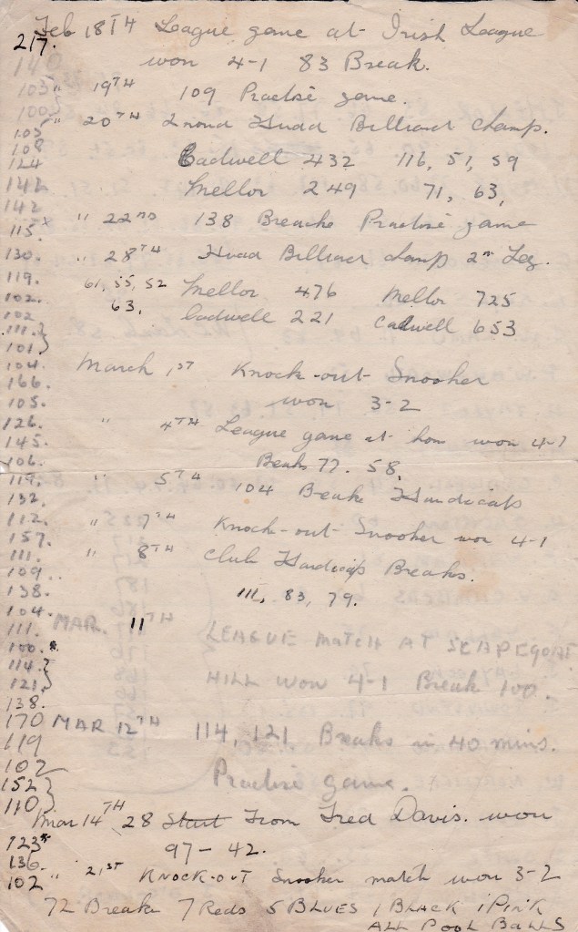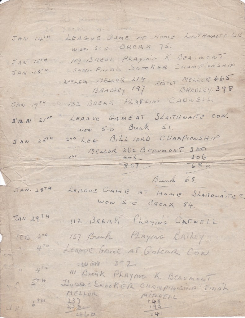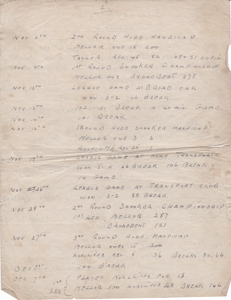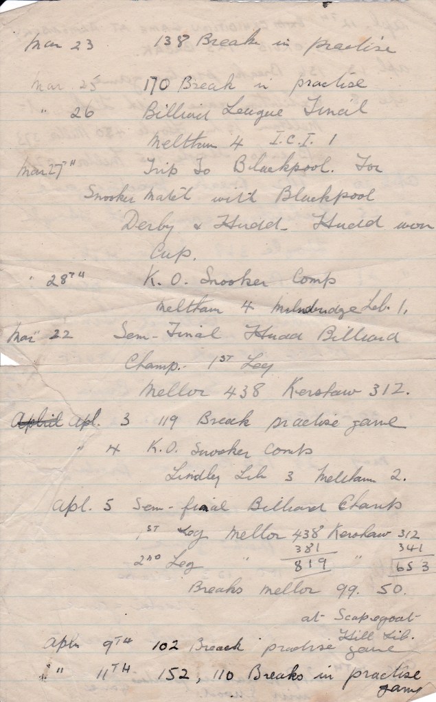 In November, the Huddersfield Snooker Championship had started. Dec 7th, “Played Norcliffe for 5£” and won.