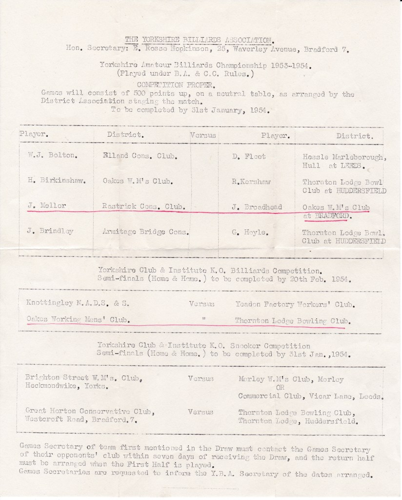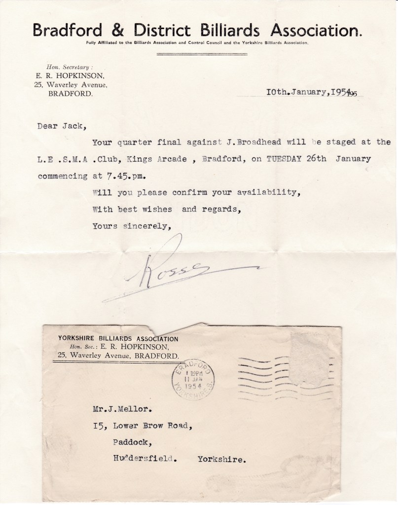 Confirmation that Jack won his quarter-final against Jim Broadhead and now meets Harold, again not in Huddersfield as one might expect, but at Brighouse. The table there won’t be new to him or Harold as they are both playing for Rastrick Constitutional Club in the Halifax Parish League, and Thornhill Briggs also play in the league. It is nice of Rosse to wish him good luck in both matches. I think Jack and Rosse have become good friends over the years as you will see in another letter later on.