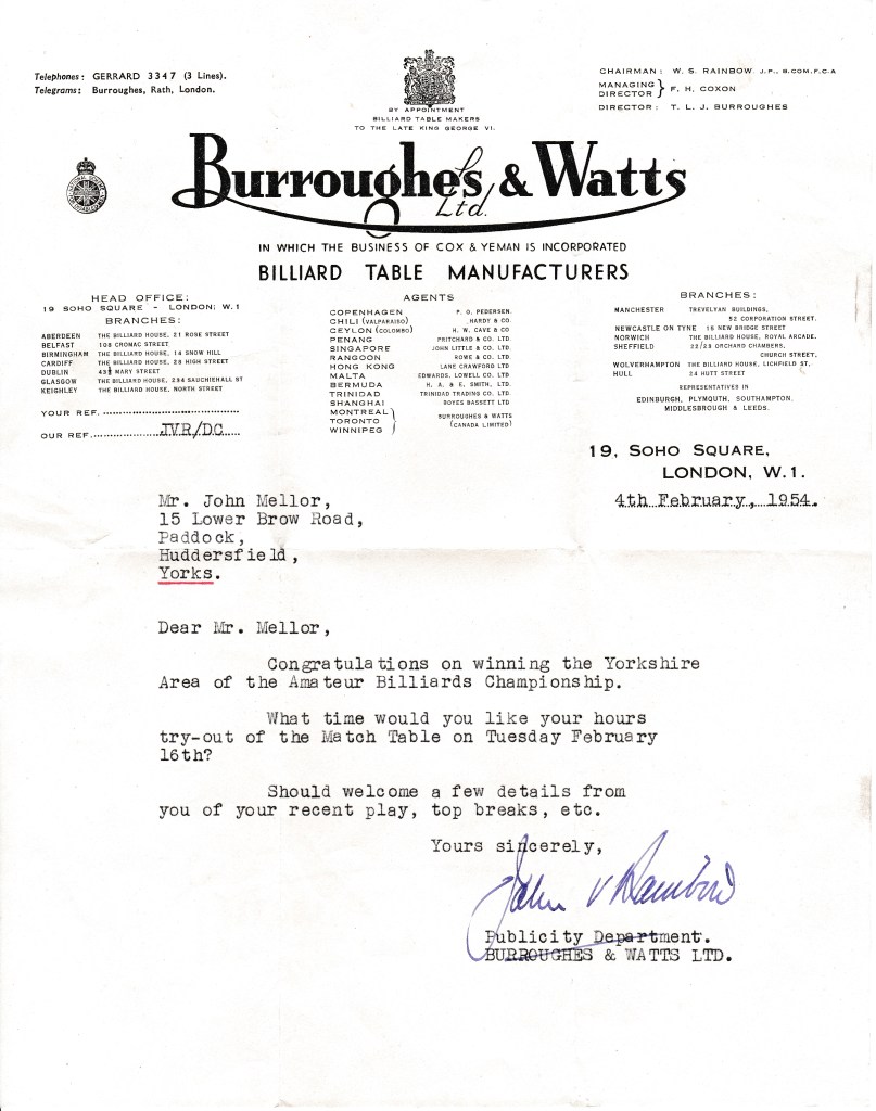 For the second consecutive year Jack had made it to the Championships proper and here we have a letter from Burroughes & Watts asking when he would like to have an hours practice on the match table at the venue. You will notice that the letter is addressed to John, Jack’s given name and possibly the only thing I have in all the letters, newspaper clippings and memorabilia with it on.
