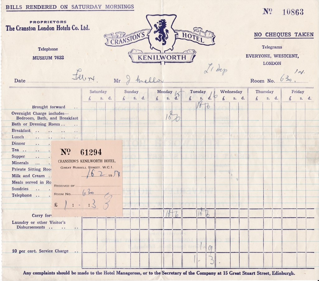 Another bill for Jack’s overnight stay in London: a different hotel from the previous year but still in the same group of hotels. The Kenilworth is on Great Russell Street which is only round the corner from the Ivanhoe and so just another eight minute walk to Soho Square.
