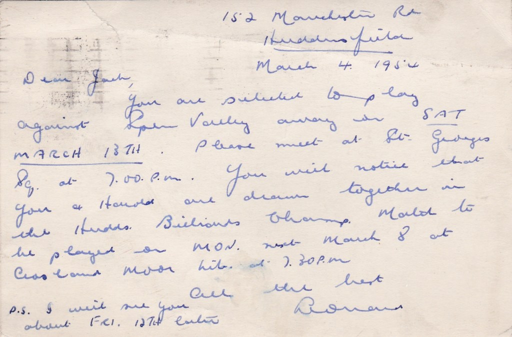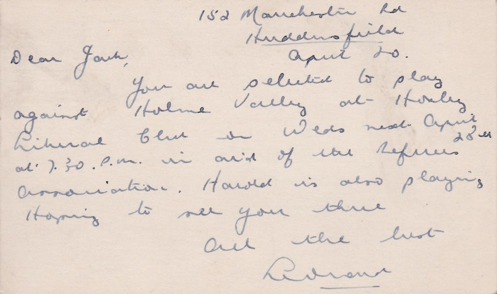 It seems as though Leonard Oldham, secretary of the Huddersfield Association, likes to use postcards for his form of communication. This one refers to Huddersfield’s Yorkshire League game. They are usually played on Saturdays and they will be taken to Heckmondwike by coach along with their supporters. This will be after he has given the exhibition match with Gladney Hoyle at Dalton Grange the night before. The letter across is a request for another exhibition, this time with Harold Burkinshaw at Manor Croft Club & Institute, Skelmanthorpe for the Dearne Valley League presentation night. The card above also mentions that Jack is to play Harold in the Huddersfield Billiards Championship having already met him in the Yorkshire Championship earlier.